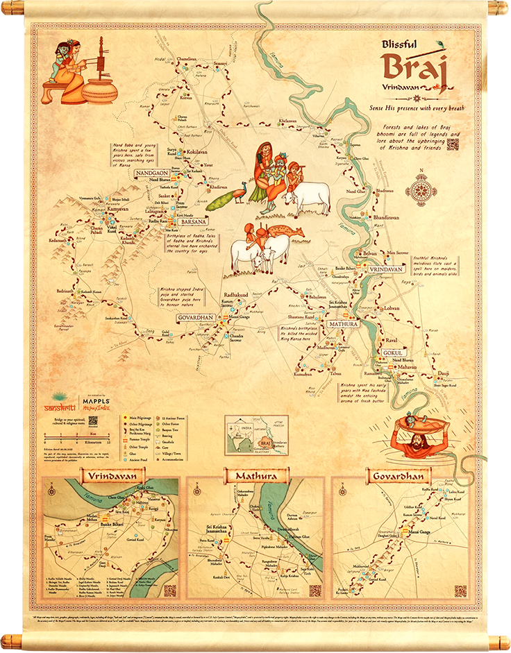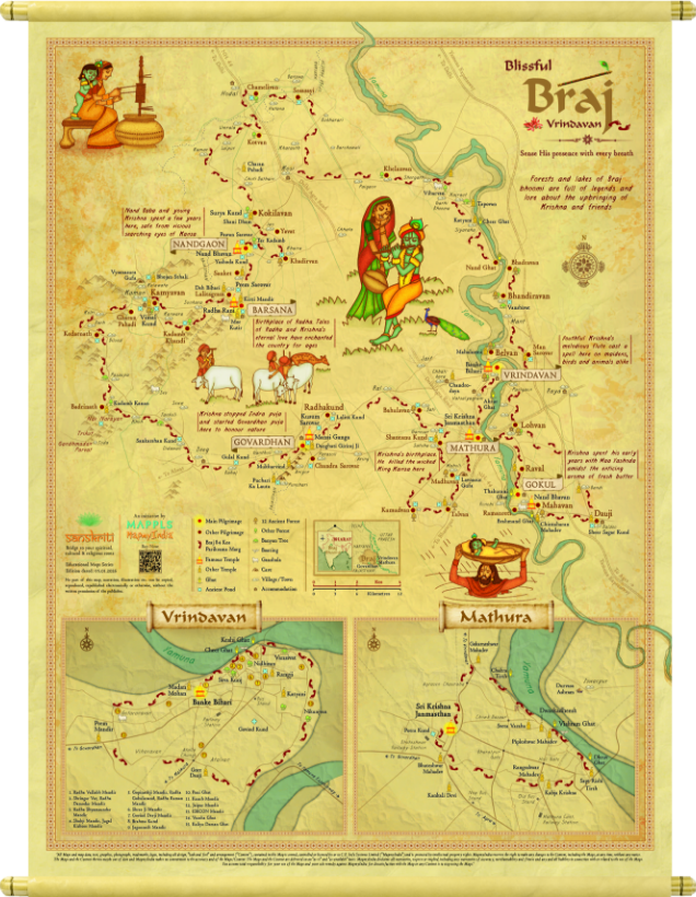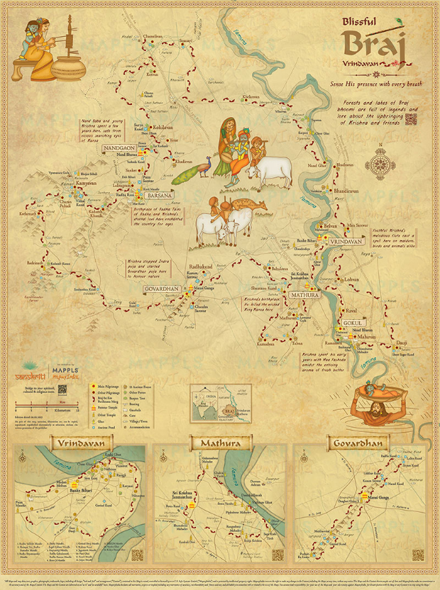 Shows the sacred sites, forests and lakes of Braj Bhoomi associated with Krishna's