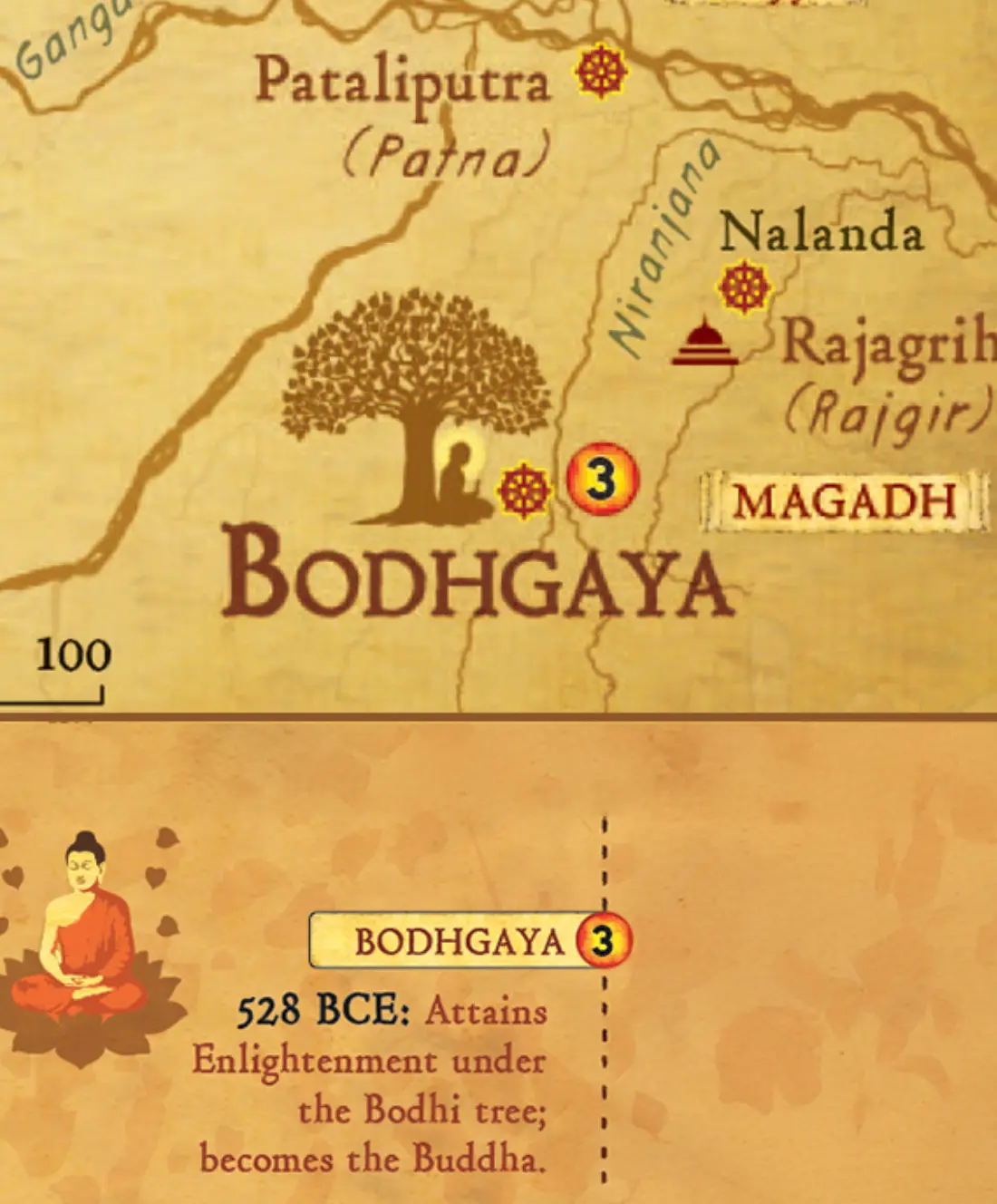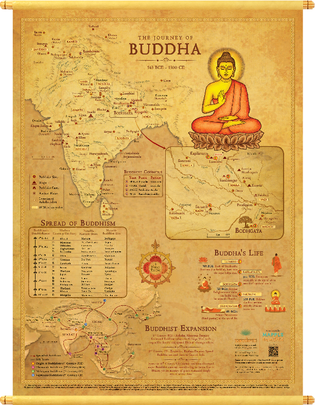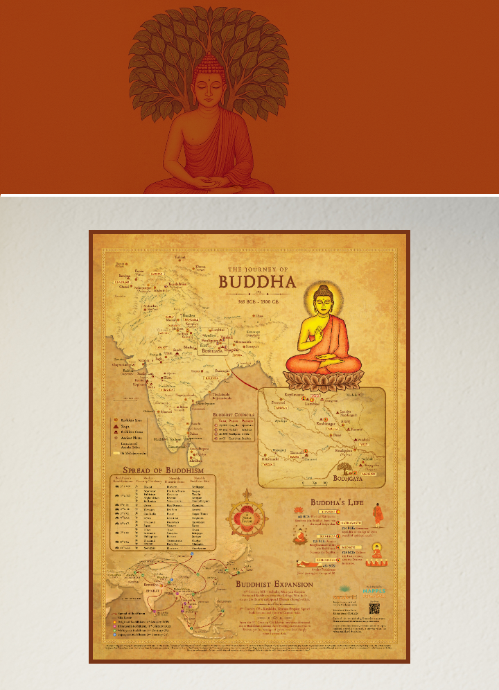 Witness how Buddhism blossomed across India and the world. The map showcases Buddhist sites, stupas, caves, locations of Ashoka’s edicts, and ancient places — tracing the routes that carried the message of compassion beyond borders.