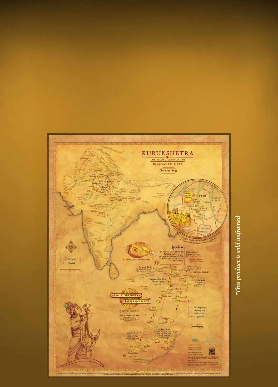 This inset map represents the geography of the major kingdoms involved in the events leading up to the Mahabharata War, including Kuru, Panchal, Matsya, and neighbouring regions. It reflects the political landscape of the time, where diplomacy and alliances shaped the course of history. The map also references Viratnagar in the Matsya kingdom, associated with the crucial discussions between Yudhishthira and Sri Krishna, including the proposal of five villages to the Pandavas in a final effort to avert the great war.