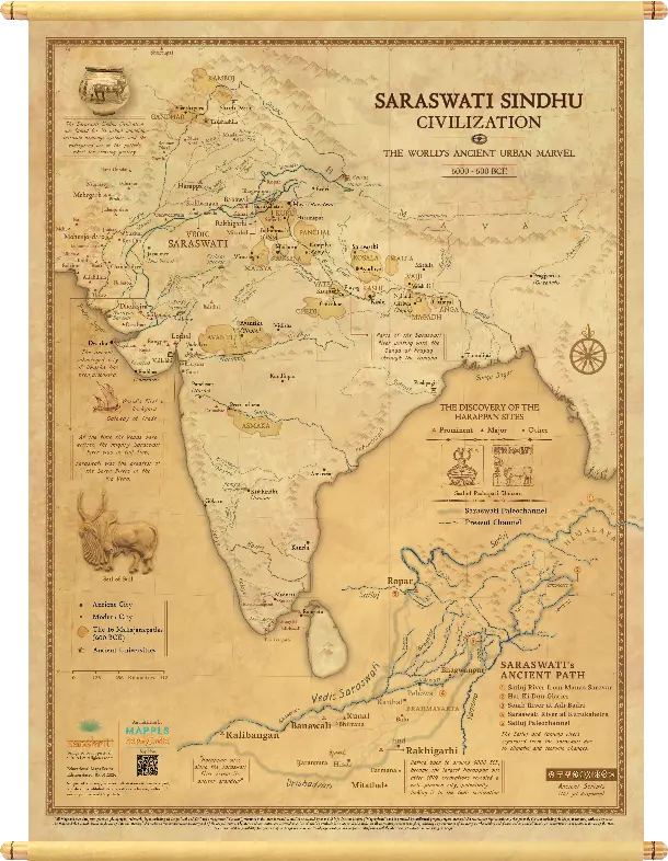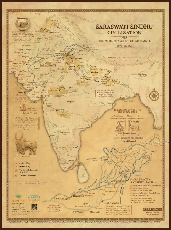 The map highlights the major Harappan sites discovered across this region. As Saraswati flowed in full force, cities rose along her course — remarkable for their sophisticated layouts, advanced drainage systems and widespread use of the potter’s wheel.