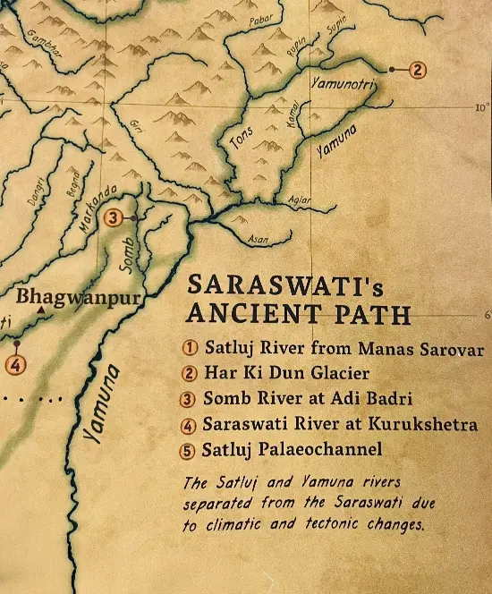 Long before its disappearance, Saraswati was the lifeblood of early India — a river praised in the Rigveda as the seventh and the greatest of the seven rivers of Sindhu. One of the most compelling aspects of this map is its detailed portrayal of Saraswati’s paleochannel.